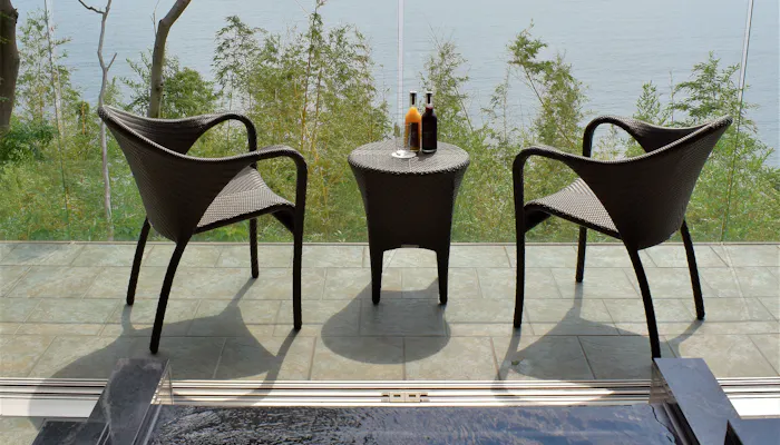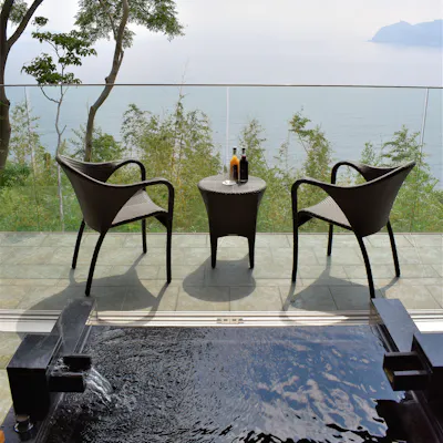 温泉で温まった後は、すぐにテラスで涼むことができるなんて最高!