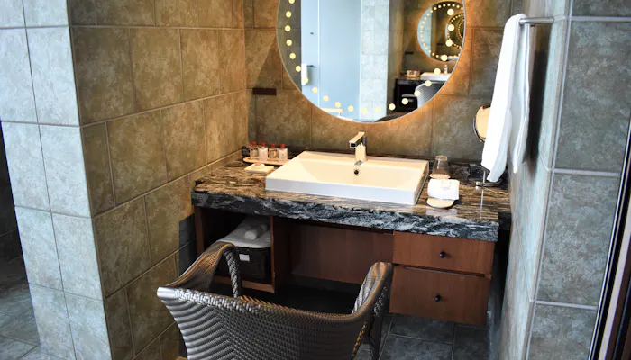 洗面台は、お風呂の両サイドに2カ所あります。ハリウッドミラーがとても可愛いです。