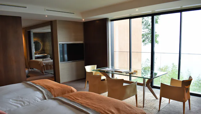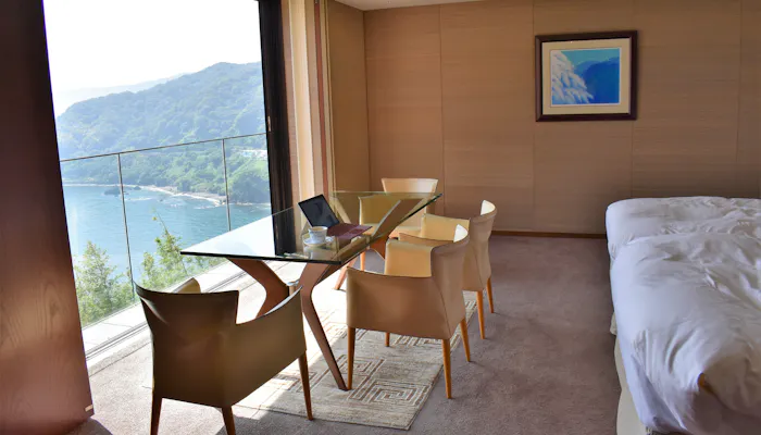 客室内に専用露天風呂がついたオーシャンビューのゲストルームは、全部で13室。今回は、1階のコーナースイートに滞在しました。