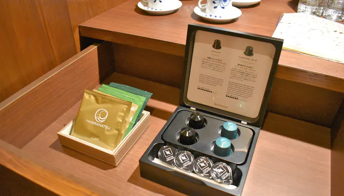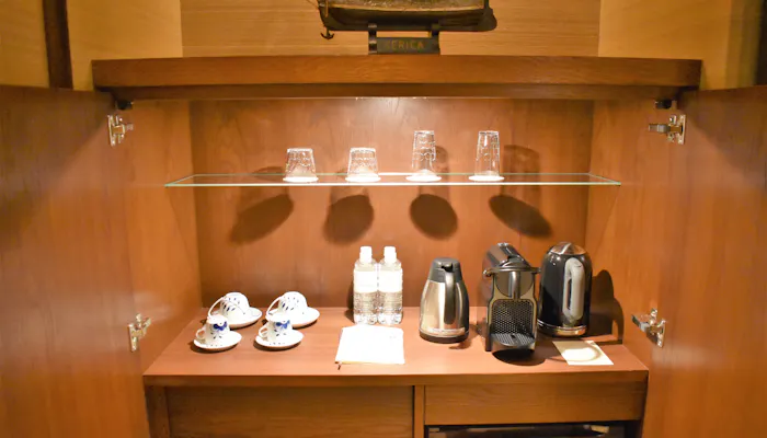 ベッドの横にはミニバーがあります。カップ&ソーサーは、「ロイヤルコペンハーゲン」。ホテルや旅館にある食器が素敵だと、ついつい利用してしまいたくなります。