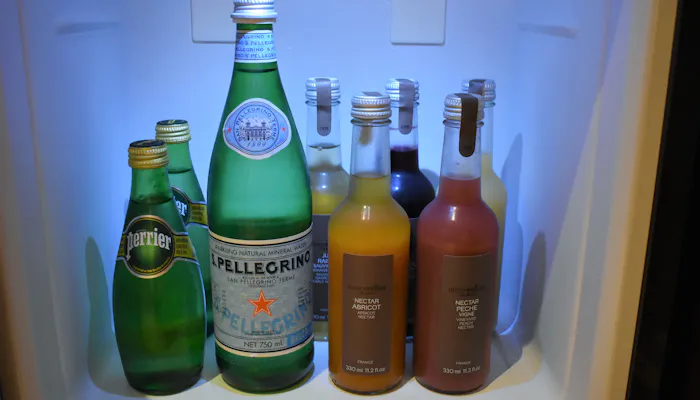 冷蔵庫にあるドリンクは全て無料です。ウエルカムドリンクでもいただいた「アラン・ミリア」のフレッシュジュースとスパークリングウォーター。私は、濃厚なネクターのジュースをペリエで少し割っていただくのが好きです。