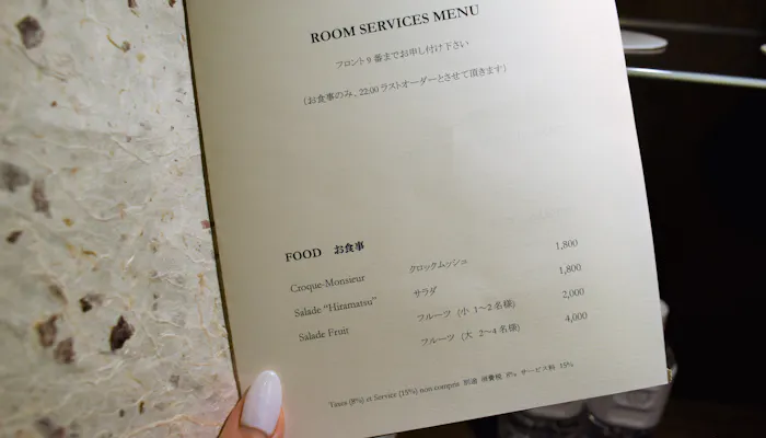 ルームサービスのフードと、アルコールメニュー。「THE HIRAMATSU HOTELS & RESORTS 熱海」特製のクロックムッシュが気になります。きっと美味しいのでしょうね。