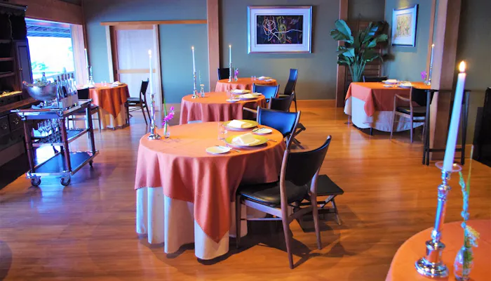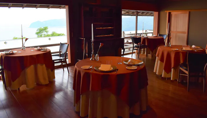 写真は夕食がスタートする17時半頃のものなので、雰囲気が伝わりづらいかもしれませんが、夜になるにつれて、各テーブルに置かれているろうそくの灯りが輝きを増してロマンティックな空間に変わっていきます。