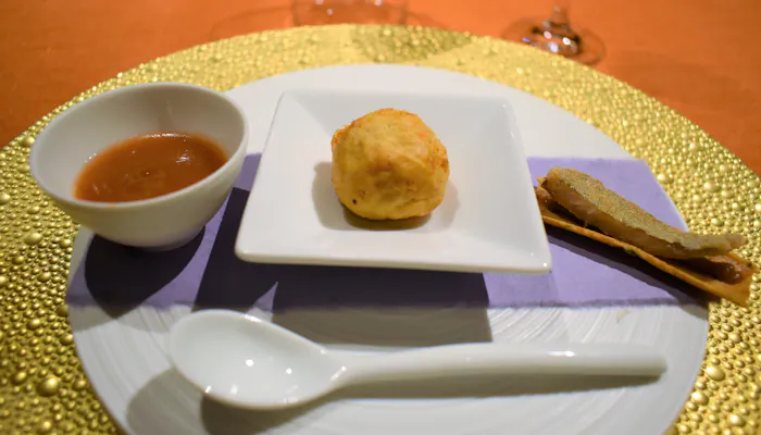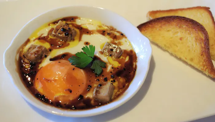 こちらは、フォアグラ×黒トリュフの目玉焼き。あわせていただく、ブリオッシュも添えられています。 朝からランチのコースをいただいているような満足感がありますね。
