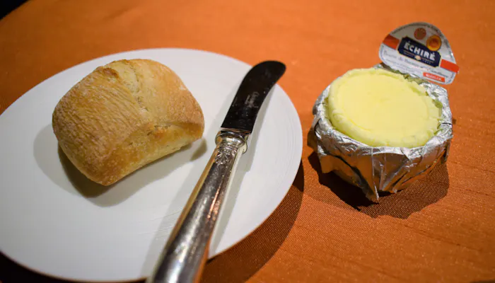 もっちり食感のハード系パンは、自家製の焼き立て。 それと共に、エシレのバター30gが丸々1つ添えられます。バターのパッケージを目の前で開けてくださる演出もいいですね!
