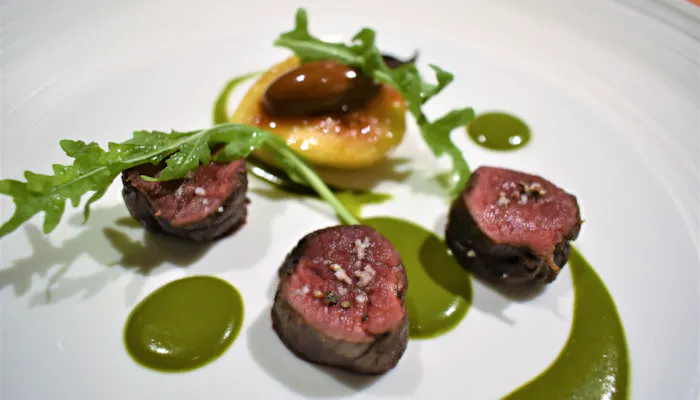 絶品だった夏鹿のロースト。熱海近郊で捕れた鹿肉を、地元の漁師さんが届けてくださるそうです。一般的には秋から冬が時期とされている鹿ですが、「こと鹿」に限っては、エサが豊富な春夏が美味しい時期とも言われているんですね。 こういったプチ豆知識までメニューに記載されていました。