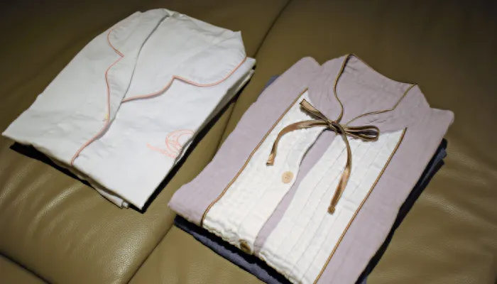 国産綿100%のパジャマ。パジャマとは別にお部屋着も用意されており、お部屋にいるときはこちらに着替えてリラックスできました。