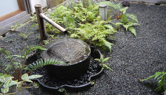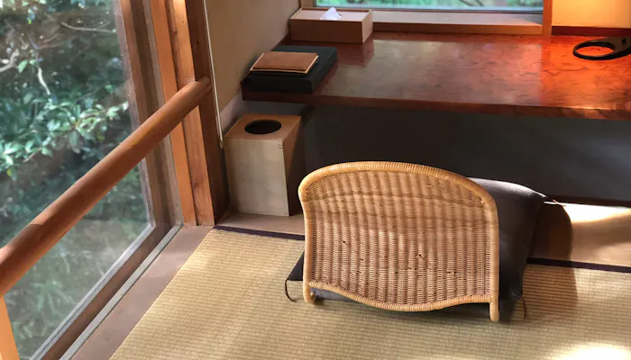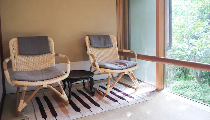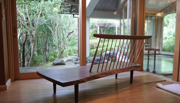 外の池を眺めるように置かれたジョージナカシマの椅子。湯上りも、まるで自然の中にいるかのような感覚でゆったり過ごせます。
