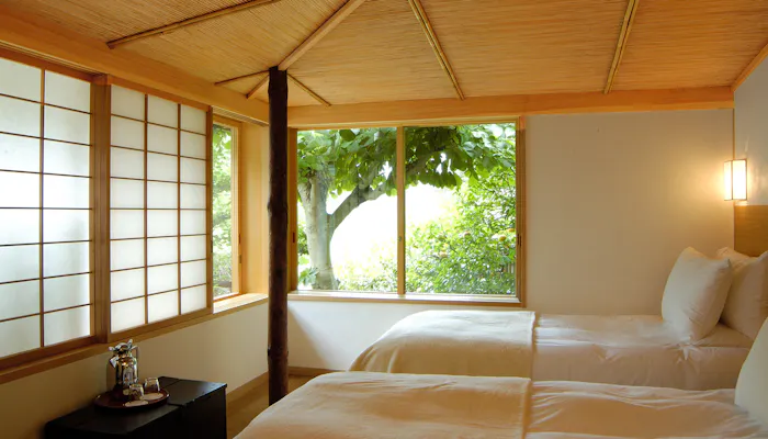 寝室にはツインベッドが配され、障子を開けると木漏れ日が差し込みます。