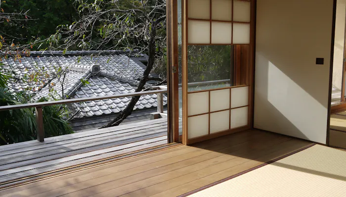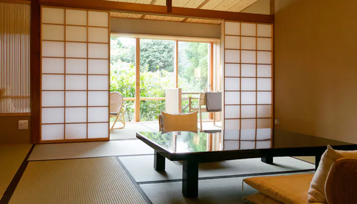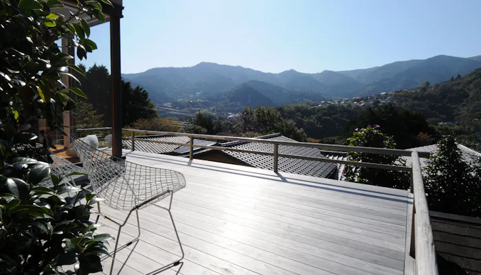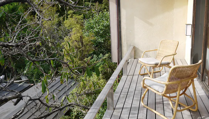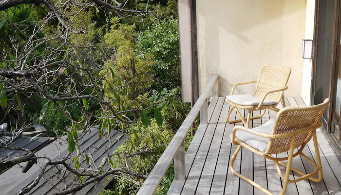 このお部屋で特筆すべきは、吹き抜ける風が心地よいテラス。目線の先にはオガタマや桃、杏子、梅、桜の木々が生い茂り、自然の息吹を間近に感じられます。