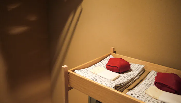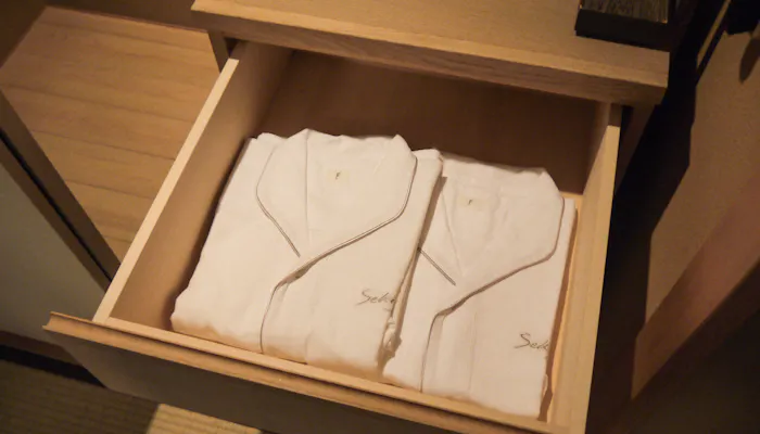 和室には珍しいウォークインクローゼットは、長期滞在の方にも嬉しい仕様。浴衣と上下セパレートのパジャマが用意されているので、ストレスなく眠りにつくことができます。