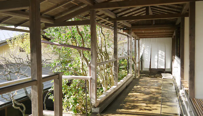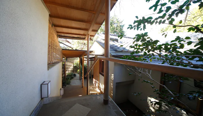 昭和時代の別荘を改装した離れ「草楽庵」はお宿唯一、和洋室の造りをした一軒家。外廊下を通る導線は、プライベート感を演出してくれます。
