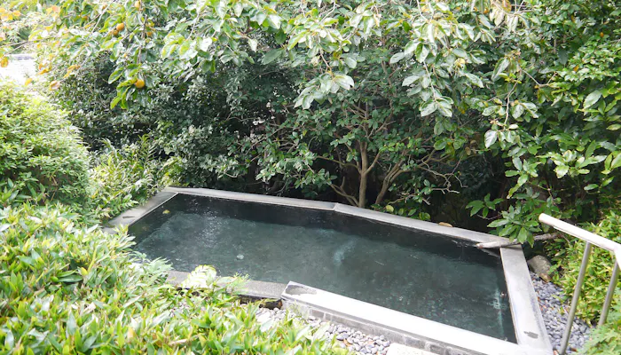 こちらの露天風呂は岩風呂。木々に囲まれた浴槽は、秋になると紅葉風呂も楽しめるとか。