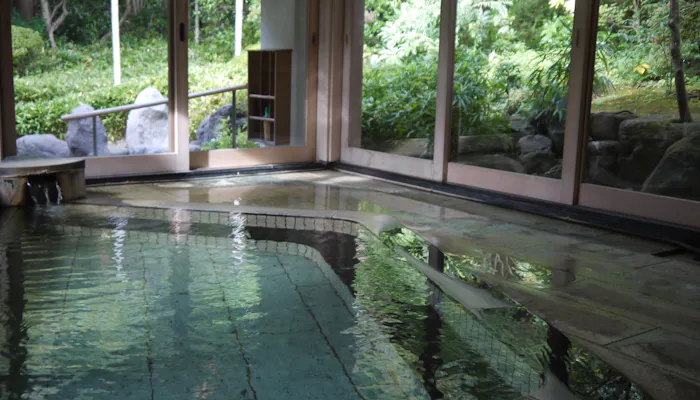 台形型が珍しい大浴場は、3面の窓から光が差し込む構造。内風呂にも関わらず、開放的な雰囲気で湯浴みを満喫できます。