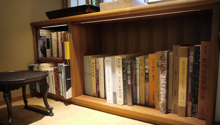 玄関の横に位置する待合室は、滞在中いつでも利用できるパブリックスペース。本棚に置かれた本はお部屋で読むこともできるので、お気に入りを探してみて。