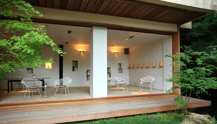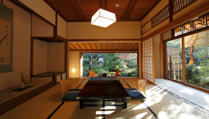 館内すべてが掃き清められた静謐な空間。夏には窓や戸は開け放たれ、庭の木々や水音、鳥の声と一体となった滞在が叶います。過剰な装飾はあえてせず、簡素なインテリアながらその空間がまとう空気はかなり上質。この空気感の中に身を置きたくて、「いつかは必ず訪ねたい」と、人々の心の中にしっかり刻まれ続けているのです。
