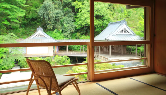 16室ある部屋も造りはそれぞれ異なります。「おひと間」は内風呂もなく、ひと間だけのシンプルな部屋ですが、それゆえに比較的リーズナブル。しかしながら能舞台と石舞台がほぼ正面に見える特等席で、この眺めを求める人にはうってつけの部屋でしょう。