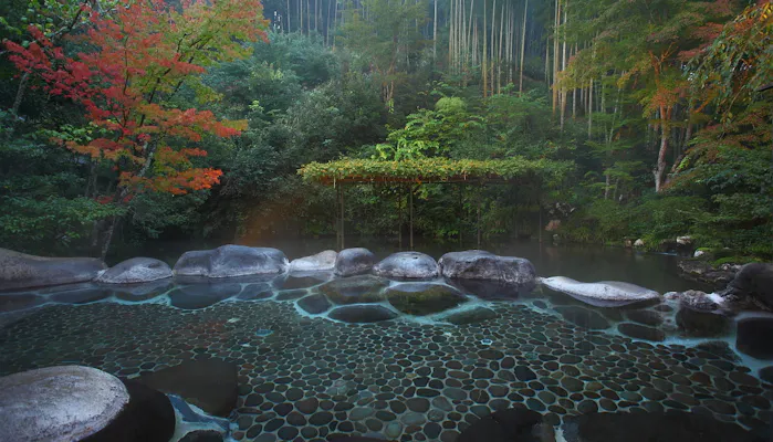内風呂が無い部屋でももちろん温泉は楽しめます。竹林と池を見ながら入浴できる野天風呂、男女別の高野槙の内湯、そして予約不要な貸切風が2箇所も。無色透明のアルカリ性単純泉を源泉掛け流しで堪能してください。
