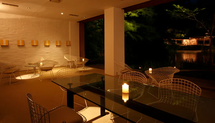 サロンは夜にはバーに。灯りの中に浮かぶ能舞台を眺めながら、さらにグラスをかたむけて…。眠るのが惜しいような、でも心穏やかに深い眠りに落ちてしまいそうな…。極上の夜が始まります。