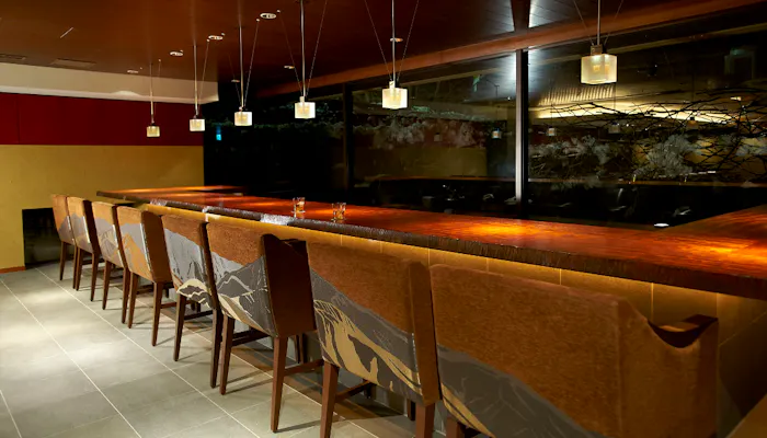 落ち着いた灯りに照らされたカウンターとチェア。大人の空間であることを一層感じさせます。