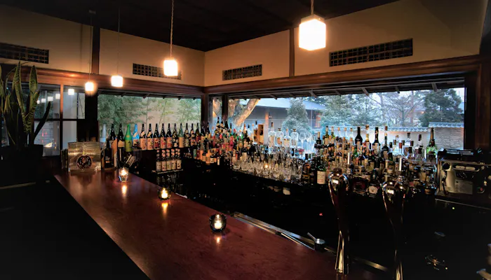 「ウィスキーやワインはもちろん焼酎、果実酒なども用意しています。それらが置いてあるバックバー越しには、四季折々のお庭の表情が眺められます。夜には少しだけライトアップするので、非日常感をより味わっていただけると思います」(鈴木さん)