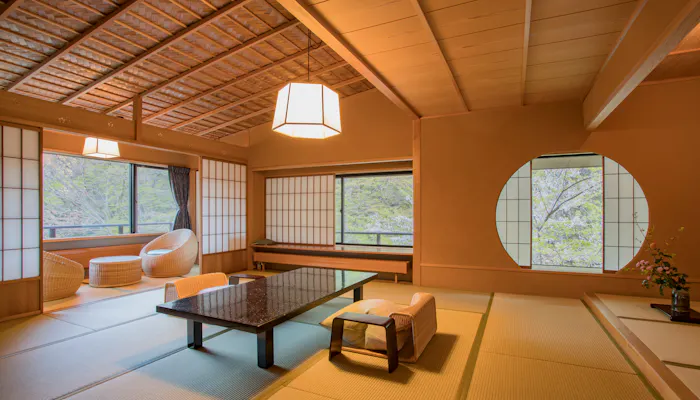 テーマの異なる12室の客室には、全て半露天風呂が備わります。貸切露天風呂とはまた違ったシチュエーションで、プライベートなひとときを過ごしましょう。