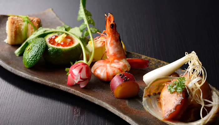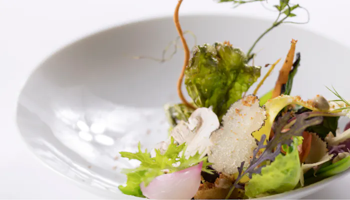 このお宿の醍醐味ともいえるのが、お食事。地元の豊富な海山の幸とガストロノミーを融合させた“五感を刺激するエモーショナルフレンチ”は、独創的な見た目も特徴。目で見て舌で味わう至高のひとときを。