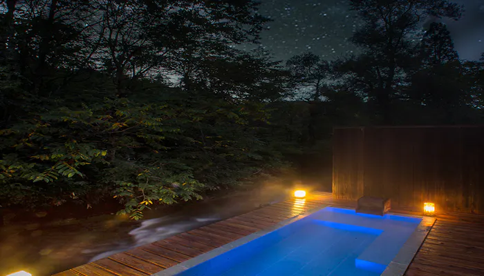 湯治場としても知られる湯川温泉に佇む「山人-yamado-」。貸切露天風呂は、渓流にせり出すようにあり、野趣あふれる雰囲気です。湯船に浸かると目の前には木々が広がり、今にも手が届きそうなほど。夜には星空を見上げながら、幻想的な湯浴みが愉しめます。