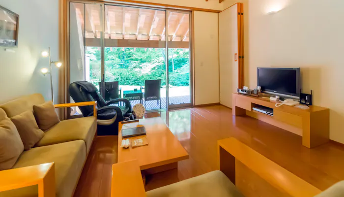“紫夕”のお部屋に備わるワイドデッキスペースには180インチのスクリーンが備わり、映画鑑賞も可能。川のせせらぎに包まれながら、解放感あふれる空間で思い思いに過ごしてみては。