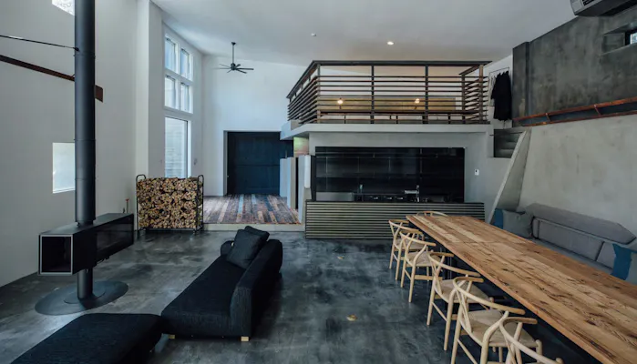 元々撮影スタジオだったこともあり、室内は無機質ながらセンスの良さが随所に感じられる空間。1階と2階はそれぞれ5名まで、全体を貸し切ると最大10名まで宿泊可能。友人や家族と、大勢での宿泊にもぴったりです。