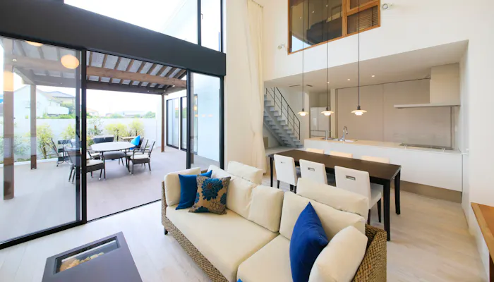 「919ヴィラ ロングビーチ ドッグフレンドリー」は、その名の通り愛犬との時間を満喫できる一棟貸切タイプのバケーションレンタル。白を基調にした室内は天井も高く、開放感を演出しています。