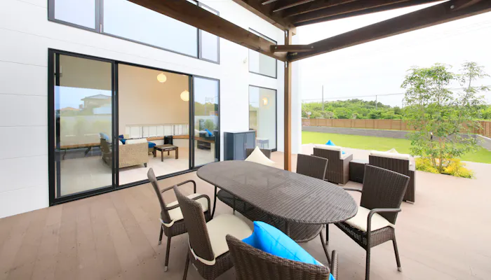 九十九里浜へは徒歩4分。100坪の庭には屋外シャワーが用意され、ウッドデッキからはそのまま浴室へ出入りすることもできるので、身体一つで海水浴や散歩へ出かけても安心ですね。