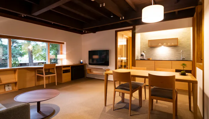 古民家をフルリノベーションした「鎌倉 古今」。和と洋が共存するリビングや、足を伸ばしてくつろげる和室など、お好みのスペースでリラックスタイムを過ごせます。専属コンシェルジュもいるので、なにかあれば気軽に相談を。