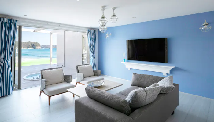 「Aquaholic Iritahama」は、入田浜のビーチ上に立つヴィラ。都心から2時間を少し超えてしまうものの、150平米を超えるスタイリッシュな室内は、ブルー系のインテリアで統一されラグジュアリー感が漂います。