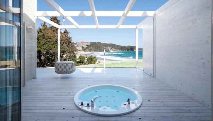 バルコニーと白い砂浜は階段で繋がっており、プライベートビーチ気分ですぐに下り立つことができます。潮風で冷えた体は、ジャグジーをはじめ遊び心溢れる五右衛門風呂で温めて。