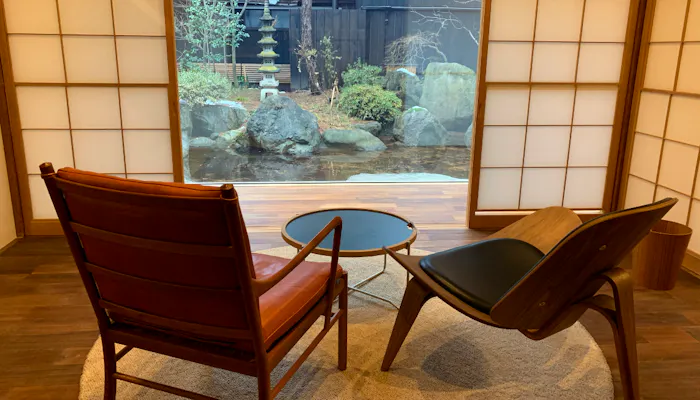 ミッドセンチュリーなチェアーなど設えにもこだわっていて、古さを一切感じない空間です。リビングの正面にはプライベート庭園がひろがり、ゲストの癒しを誘います。