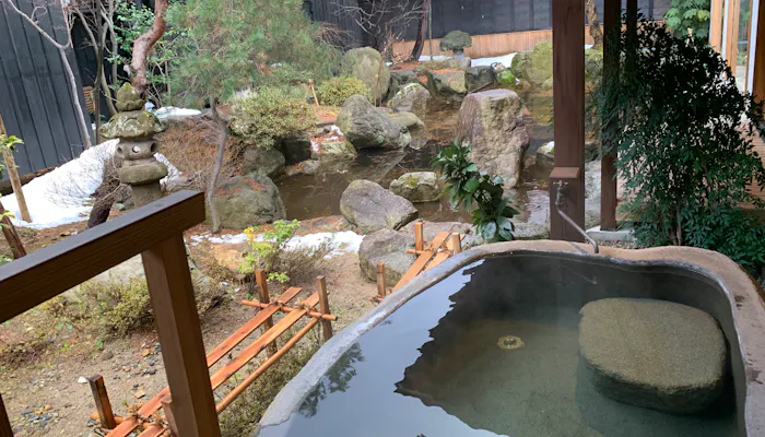 お庭に面して、蔵王石の巨石をくり抜いた露天風呂が備わっています。平成を代表する有名女性ミュージシャンがこのお部屋に2泊して満喫したそうです。