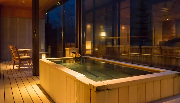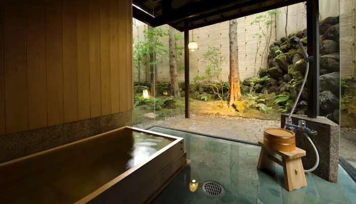 客室に備わる内風呂は、大きなガラスで覆われているため、景色は露天風呂。天候に左右されずに露天気分を味わえるのは贅沢です。夕食朝食をお部屋でいただけるので、「お部屋から一歩も出たくない」というおこもりステイ派の方にもオススメ。