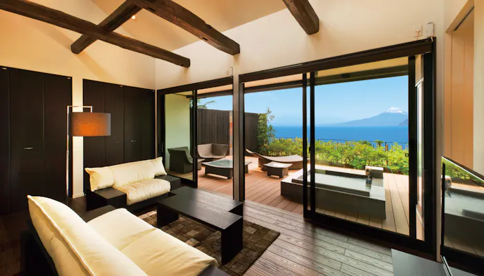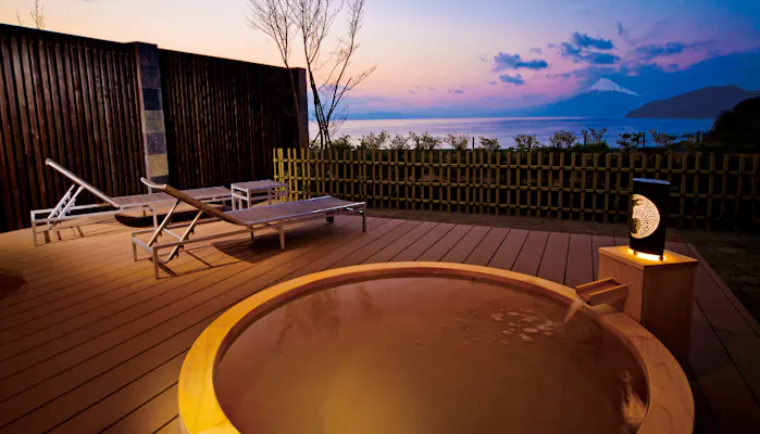 デッキに温泉露天風呂が備わり、湯浴みと共に富士山を望むことができます。湯に入りながら時間と共に変化する富士山がある景色を、心ゆくまで堪能してください。