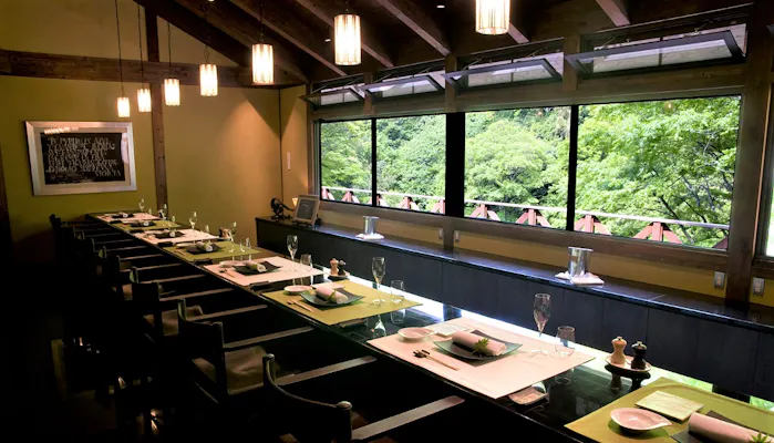 モダンな設えのダイニングでは、有馬の和食職人が神戸の異国の料理に出会って生まれた「御所別墅山家会席」がいただけます。素材本来の旨みをしっかりと味わえる逸品は、料理の味を引き立てる豊富なワインとともに召し上がれ。