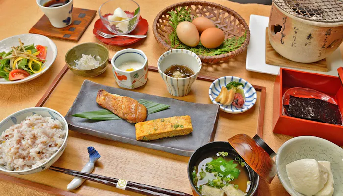 朝食には、敷地内で育ったニワトリの生みたて卵や自然農法の自家菜園で獲れた新鮮野菜、ほかほかの十六穀米ごはんが並びます。添加物を使わない “からだにやさしい”をテーマにした料理の数々を、お腹いっぱいいただきましょう。