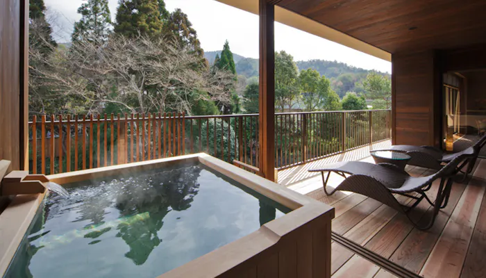 京の奥座敷としても名高い、亀岡・湯の花温泉郷に佇む「京 YUNOHANA RESORT 翠泉」。細やかな“翠泉流のおもてなし”を感じる、大人のための隠れ宿です。館内で最も広い「翠泉スイート」は、客室露天風呂が備わるスイートルーム。
