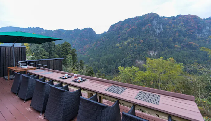 お食事処「白加賀」から繋がる「あさもやテラス」は、ぜひ訪れたい絶景ポイント。あさもやの移りゆく景色を眺めながら、朝食後のデザートやドリンクをいただくことができます。渓谷に流れる清々しい空気が、爽やかな1日をスタートさせてくれるでしょう。