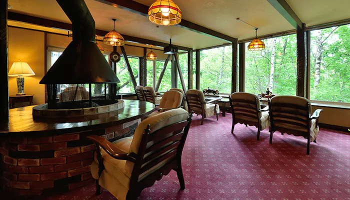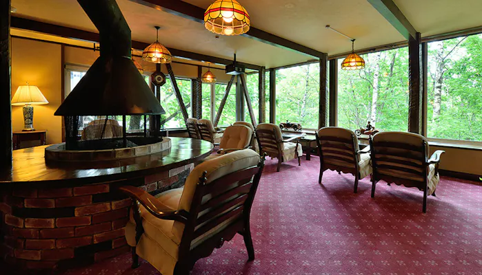 館内も木造りの重厚感にあふれています。敷き詰められた絨毯といい、アンティークの家具といい、まるで別世界の扉を開けたようなインテリア。非日常の旅の舞台としては申し分ありません。