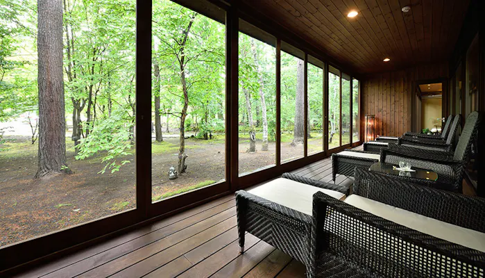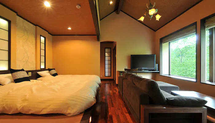部屋は本館と別館に分かれていて、フローリングのリビングを中心としたモダンな部屋が好みなら「本館 森の風」を。