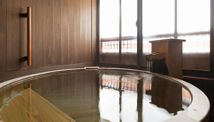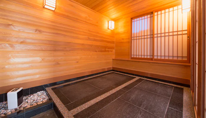 注目は専用の岩盤浴ルームを設けた部屋。専用だから、好きな時に好きなだけ岩盤浴で汗を流し、そのまま半露天風呂へ。または半露天風呂で温浴を楽しんでから岩盤浴へ。気軽に行ったり来たりできるのは、どちらも自室に備わっているからこそでしょう。ストレスなく利用できますよ。