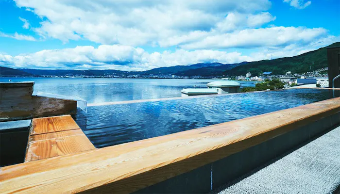 信州最大の湖・諏訪湖を目の前に望むロケーションの「寛ぎの諏訪の湯宿 萃sui-諏訪湖」。屋上に備わる展望露天風呂は、湯船に浸かると湯面と湖面が一体になり、湖に浮かぶような感覚に。最上階ならではの眺めは、クチコミでも好評です。