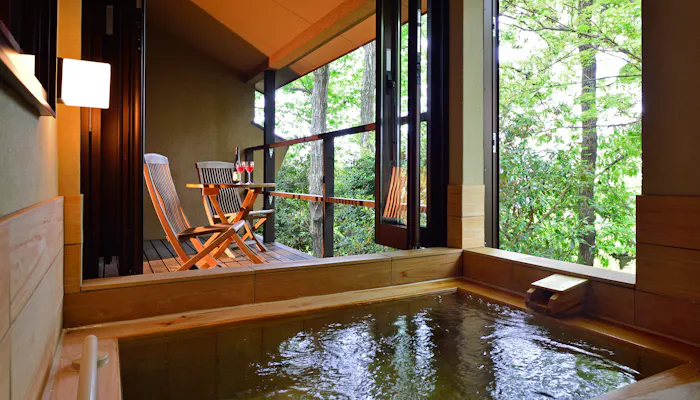 プライベートな空間で湯浴みができる“露天風呂付き客室”では、好きな時に好きなだけ温泉を堪能する贅沢な滞在が叶います。外の空気に当たりながらお湯に浸かれば、心も身体も癒されることでしょう。