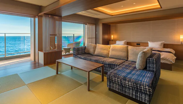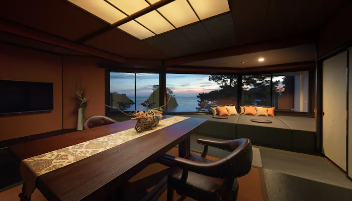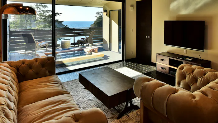 渡り廊下を進んだ先にあるメインルームでは、大きな窓から海に沈む夕陽の美しさを存分に堪能できます。テラスに備わる露天風呂で、海や空の繊細な色に優しく包まれる感覚は格別です。