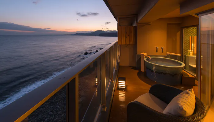 レイトチェックアウトが好評な「海一望絶景の宿 いなとり荘」。地元自慢の金目鯛を味わえる食事も高い評価を受けています。目の前に海と空の広がる、優雅な露天風呂体験を実現しました。